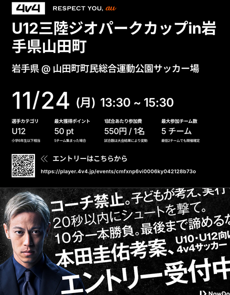 内容:元サッカー日本代表本田圭佑氏が発案の小学生ミニサッカー大会