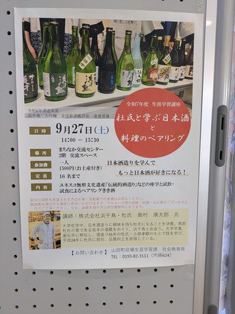 飲食 · 21日 5月 2025 終了▶杜氏と学ぶ日本酒と料理ペアリング (飲食) 9/27(土) 日程:9/27 土 14-15:30 場所:まちなか交流センター 2F交流スペース 参加費:1,500円 内容:ユネスコ無形文化遺産「伝統的酒造り」などの座学と試飲・試食によるペアリングきき酒 お問い合わせ 山田町役場生涯学習課 社会教育係 TEL:0193823111(内線624) tagPlaceholderカテゴリ: eat